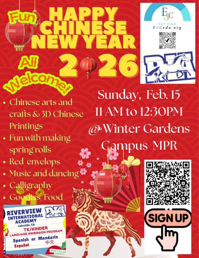 On February 15, 2026, ESC Club partnered with Riverview International Academy — the only language-immersion school of choice in the Lakeside Union School District — to host a vibrant Lunar New Year Festival that brought together students, families, and community volunteers for a day of cultural discovery and hands-on learning.