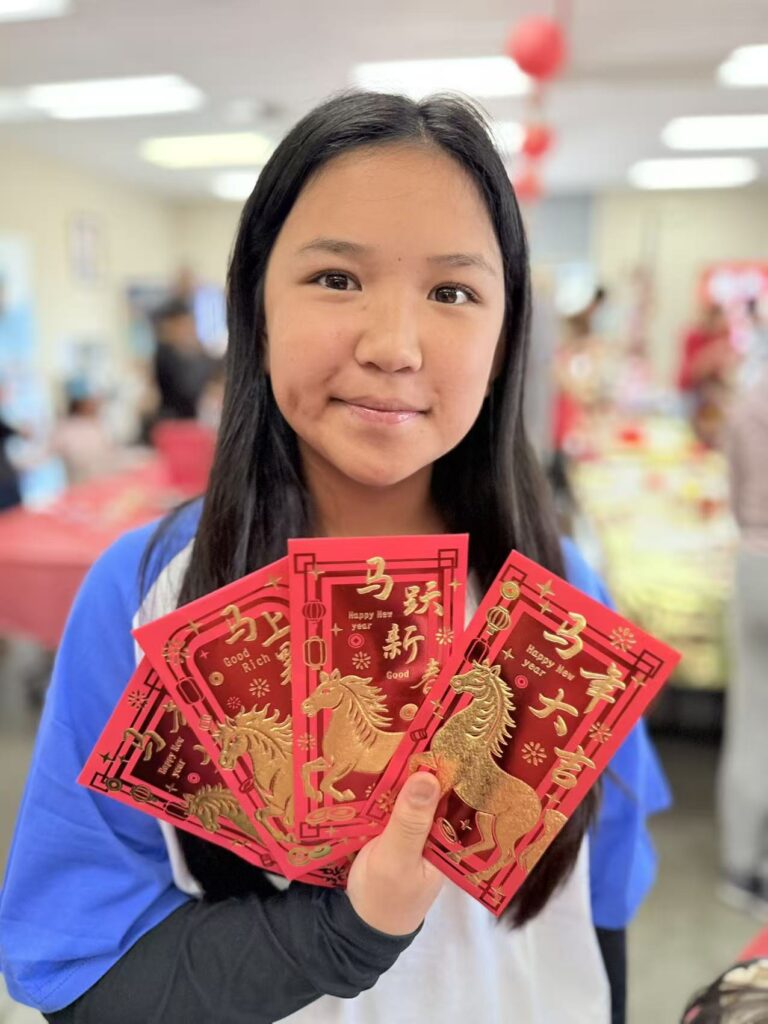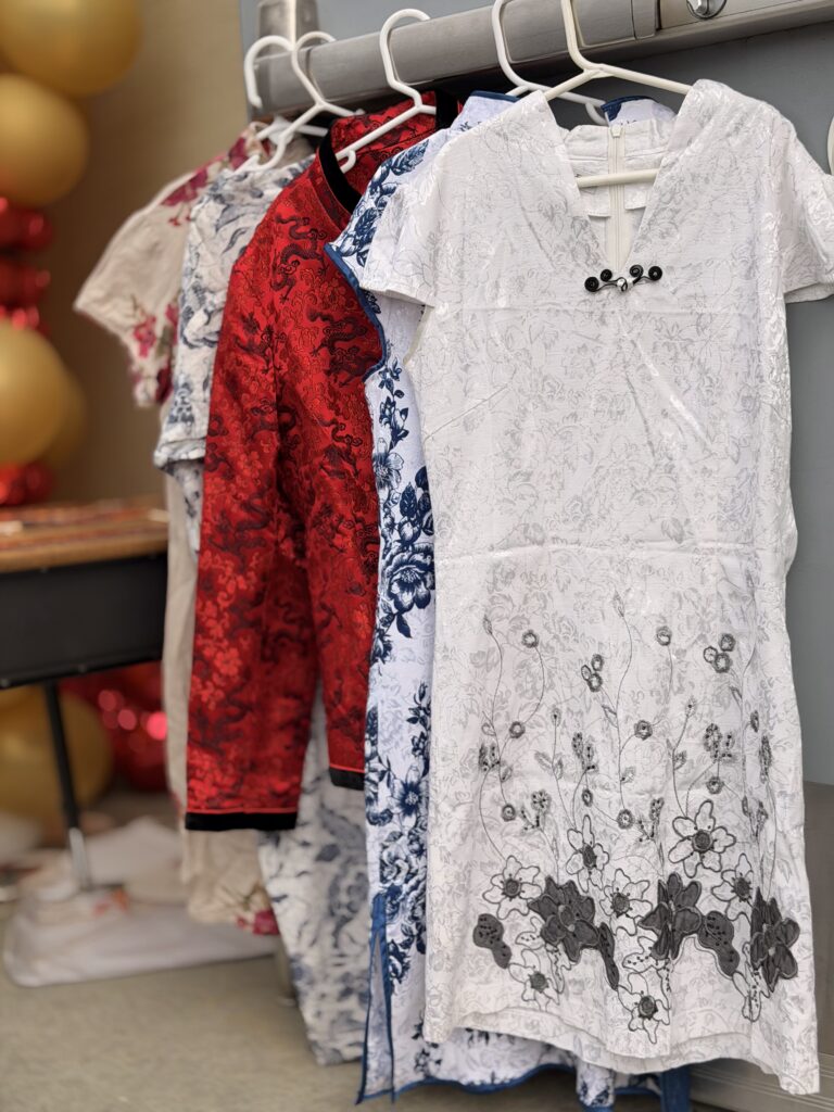 One of the most popular booths was the Traditional Qipao Tryout, where girls had the opportunity to wear elegant Chinese qipao dresses and participate in a special Lunar New Year photo experience. Students proudly posed in front of the 2026 Year of the Horse banner, celebrating cultural heritage while creating joyful memories with friends and family.