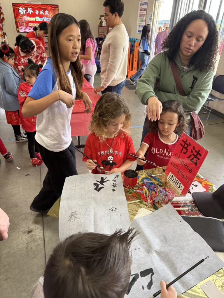 ESC volunteer Lanting Jiang guided students in practicing traditional brush writing, introducing the beauty of Chinese calligraphy.
